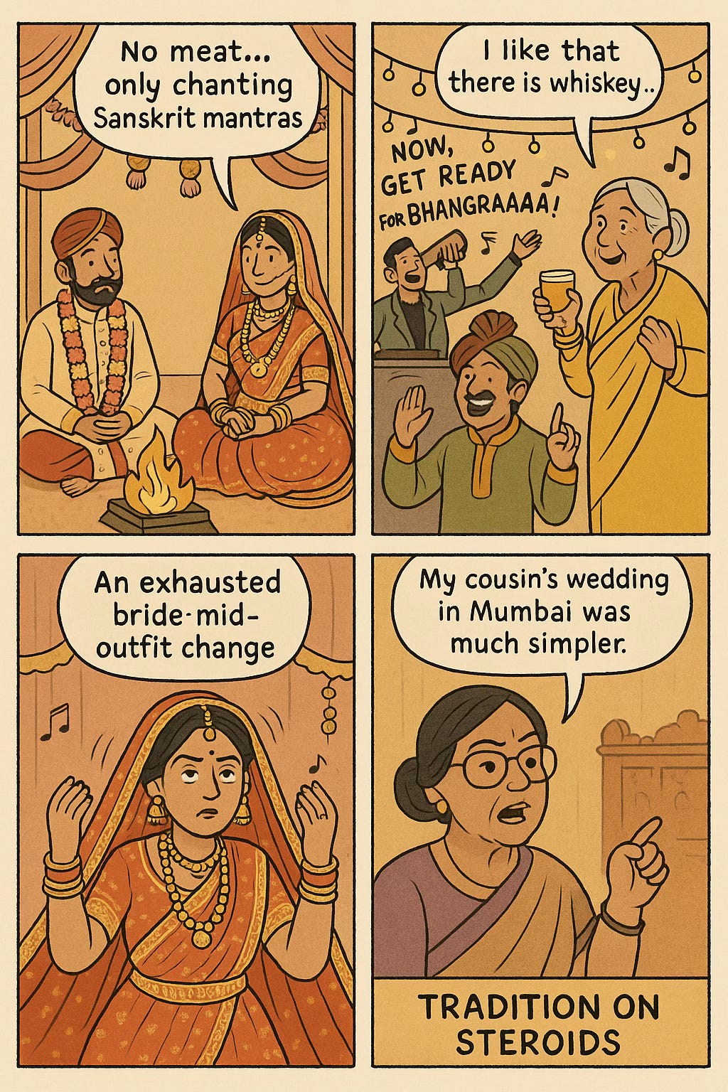 Nowhere does the tradition-modernity tension explode more dramatically than at diaspora weddings. When I lived in India, the wedding obsession irritated me beyond belief. So much so that I started attending them "under protest," wearing the shoddiest clothes I could get away with—my small rebellion against the whole circus.