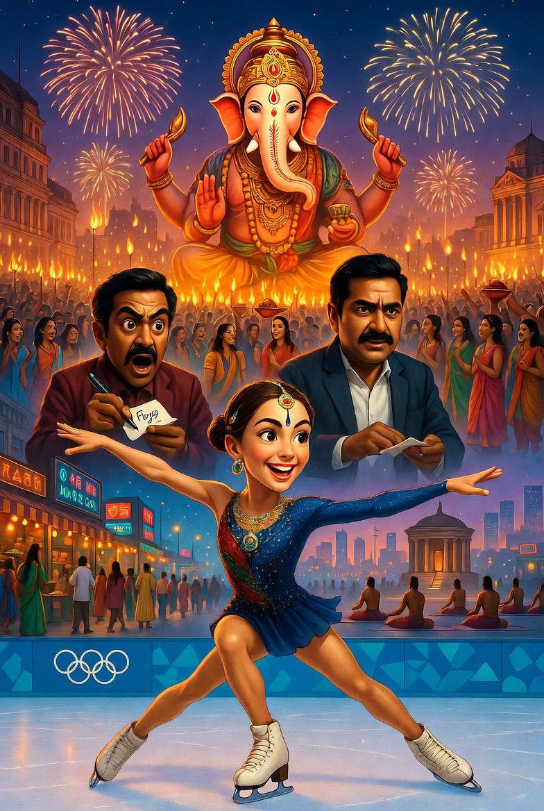 Somewhere in Milan, a Russian-Georgian figure skater is wearing a bindi and doing Punjabi folk steps on ice. Somewhere in San Francisco, a Bhangra troupe is performing at an NBA game. Somewhere in London, a British family is ordering chicken tikka masala and calling it English food. Somewhere in a boardroom, an Indian CEO is running a $2 trillion company. Somewhere in the Kumaon hills, an ashram that shaped Silicon Valley sits quietly without a website.